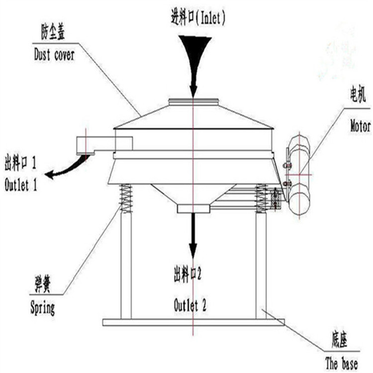 直排篩利用振動電機(jī)利用其軸上下端的兩組偏心塊(不平衡偏心塊)的相位角以及兩臺電機(jī)之間的交叉角度將振動電機(jī)的旋轉(zhuǎn)運動變?yōu)樗健⒋怪薄A斜以及離心作用的多作用力重疊,再將這種作用力傳遞給篩面,從而達(dá)到篩分的目的。改變上下偏心塊的相位角和重量,可以改變激振力的大小和物料的運動軌跡。