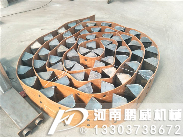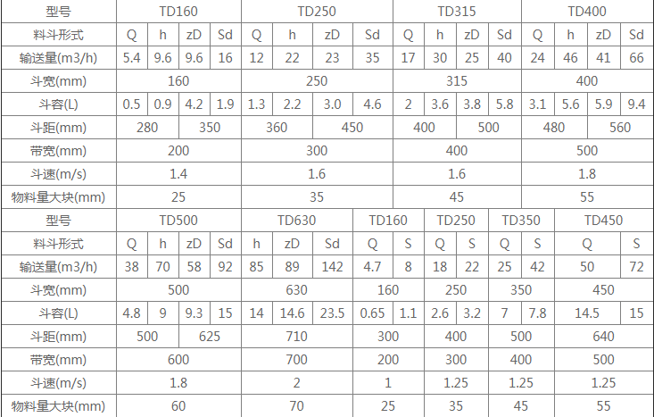 TD型斗式提升機是膠帶提升機,本公司產品根據斗子寬度可分四個型號:TD160、TD250、TD350、TD450,可采用深斗淺斗滿足不同的生產需求,最大能輸送69.6m3/h物料,提升高度為4-30m。傳動裝置TD型斗提升機的傳動裝置有兩種形式分別配有YZ型減速器ZQ(或YY)型減速器。YZ型軸減速器直接裝在主軸軸頭上,省去了傳動平臺、聯軸器等,使結構緊湊、重量輕,而且其內部帶有異型輥逆止器,逆止可靠。該減速器噪音低,運轉平穩,并隨主軸浮動,可消除安裝應力。TD型斗式提升機的牽引件為橡膠帶,料斗以一定的間隔固定在橡膠帶上,橡膠帶分別繞過提升機頭部和底部的滾筒,構成具有上升有載分支和下降無載分支的閉合環形系統;工作時,布置在提升機頭部的驅動裝置通過頭部滾筒將動力傳給橡膠帶和料斗,物料從提升機底部的進料口進入料斗,料斗將物料提升至頭部的卸料口,在離心力和重力的共同作用下,料斗中的物料經卸料口卸出。