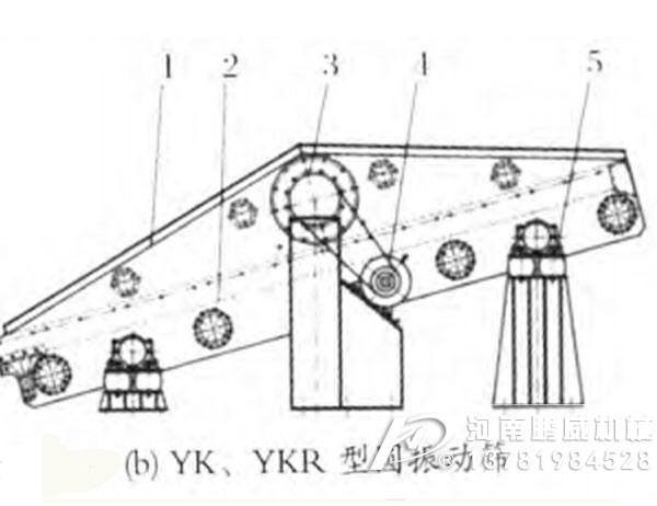 YKX稀油圓振動篩結構:由彈簧支承組、傳動裝置、篩箱、支承座、稀油潤滑振動器等組成。